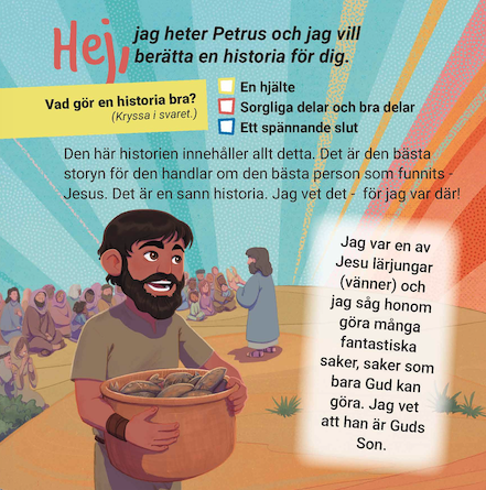 Uudessa ruotsinkielisessä evankeliumilehtisessä silminnäkijätodistaja Pietari kertoo kaikkein suurimman kertomuksen Jeesuksesta, joka kuoli ristillä ja nousi kuolleista. Evankeliumi tulee selkeästi esille. Mukana palapelitehtävä. Sivuja neliöksi taitellussa lehtisessä tai traktaatissa on kahdeksan. Tuotteen koko on 14,5 x 14,5 cm.